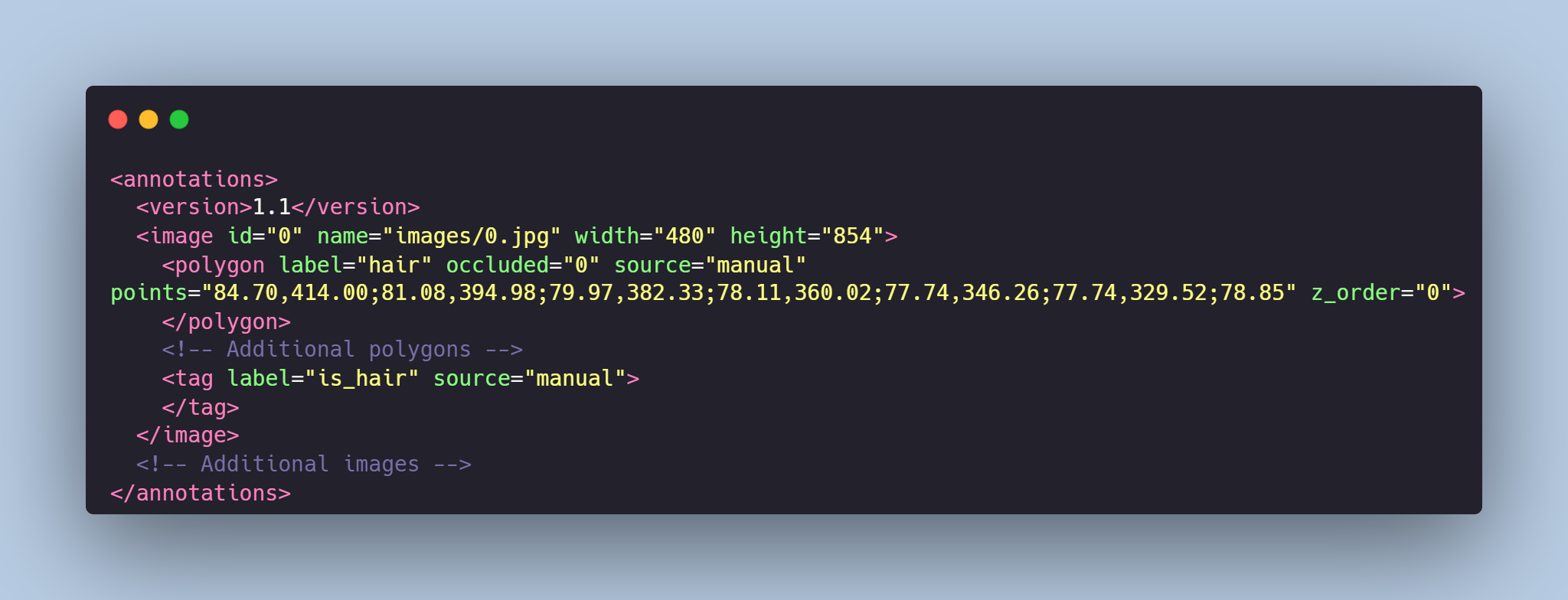 43 | "[{'type': 'polygon', 'label': 'hair', 'points': [(1524.15, 2012.83), (1523.98, 2073.48), (1515.34, 2204.81), (1515.68, 2213.8), (1525.01, 2070.89)]}, {'type': 'polygon', 'label': 'hair', 'points': [(1514.7, 2228.94), (1502.03, 2315.63), (1486.34, 2405.92), (1480.86, 2448.54), (1496.56, 2356.96)]}, {'type': 'polygon', 'label': 'hair', 'points': [(1550.88, 1486.22), (1440.31, 1543.91), (1348.96, 1649.67), (1312.91, 1793.9), (1300.89, 2034.27), (1329.73, 2265.03), (1373.0, 2471.76), (1418.67, 2551.08), (1471.32, 2609.49), (1482.61, 2413.11), (1483.33, 2145.81), (1497.52, 1837.89), (1529.97, 1611.93)]}, {'type': 'polygon', 'label': 'hair', 'points': [(1482.83, 2388.5), (1507.72, 2413.38), (1540.72, 2436.53), (1565.42, 2449.27), (1590.51, 2456.53), (1651.88, 2460.45), (1589.68, 2454.66), (1565.0, 2448.03), (1538.04, 2434.12), (1507.15, 2411.53)]}, {'type': 'polygon', 'label': 'hair', 'points': [(1484.21, 2121.55), (1512.21, 2210.04), (1548.05, 2355.09), (1567.09, 2502.38), (1565.97, 2546.63), (1562.05, 2565.11), (1548.61, 2595.91), (1536.85, 2612.71), (1506.61, 2639.04), (1509.41, 2640.72), (1538.53, 2613.83), (1553.09, 2592.55), (1562.61, 2567.91), (1568.77, 2542.71), (1568.77, 2502.94), (1562.05, 2435.18), (1551.41, 2361.81), (1531.81, 2278.92), (1489.9, 2122.1)]}, {'type': 'polygon', 'label': 'hair', 'points': [(1483.34, 2225.42), (1499.83, 2322.17), (1505.92, 2395.62), (1503.05, 2499.53), (1484.78, 2607.75), (1485.14, 2615.63), (1505.2, 2495.59), (1506.99, 2396.34), (1500.54, 2320.73)]}, {'type': 'polygon', 'label': 'hair', 'points': [(1530.45, 1658.25), (1528.71, 1724.69), (1526.22, 1785.4), (1515.84, 1868.61), (1503.65, 1942.51), (1492.2, 1971.63), (1492.95, 1974.12), (1505.39, 1943.01), (1517.83, 1868.86), (1528.23, 1785.3)]}, {'type': 'polygon', 'label': 'hair', 'points': [(1527.33, 1921.32), (1532.72, 1948.06), (1533.14, 1970.46), (1530.03, 1991.82), (1524.84, 2006.95), (1517.59, 2018.36), (1509.08, 2026.86), (1489.59, 2042.41), (1488.97, 2045.52), (1516.13, 2021.06), (1521.32, 2013.8), (1525.88, 2006.33), (1531.27, 1990.57), (1534.17, 1969.63), (1533.14, 1946.41)]}, {'type': 'polygon', 'label': 'hair', 'points': [(1493.2, 2043.74), (1499.92, 2079.07), (1497.43, 2110.28), (1496.41, 2119.06), (1495.36, 2130.9), (1495.46, 2139.39), (1497.25, 2118.79), (1498.17, 2109.98), (1500.76, 2078.9)]}, {'type': 'tag', 'label': 'is_hair'}]" |